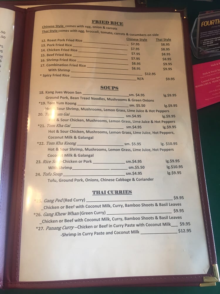 Welcome to Thai Pepper Restaurant, a veteran-owned gem offering a delightful fusion of Chinese and Thai cuisine. Located in Fayetteville, NC, this restaurant provides a plethora of options, from buffet-style meals to a la carte menu choices. Patrons rave about dishes like yellow curry, string beans, and the signature bean noodles dish that comes in generous portions. The lunch buffet, lasting till 2 pm, features must-try classics like pad thai, chicken curry, and beef basil. The cozy atmosphere and diverse menu make it a favorite spot for both lunch outings and date nights. With options for vegetarians, a full bar, and outdoor seating, Thai Pepper Restaurant aims to satisfy every craving. Indulge in flavorful dishes and experience the best of Thai and Chinese flavors at this charming establishment.